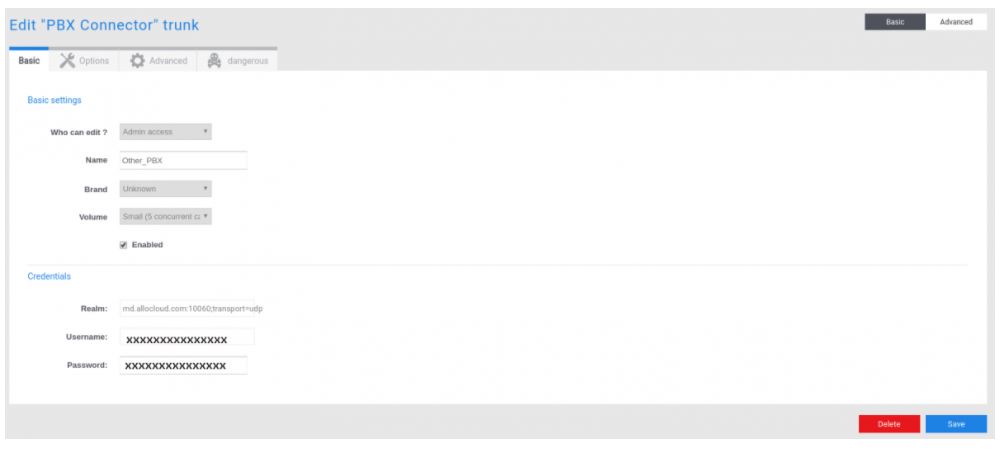 5- Copy the credentials in the PBX (hostname, port, transport, username, password)