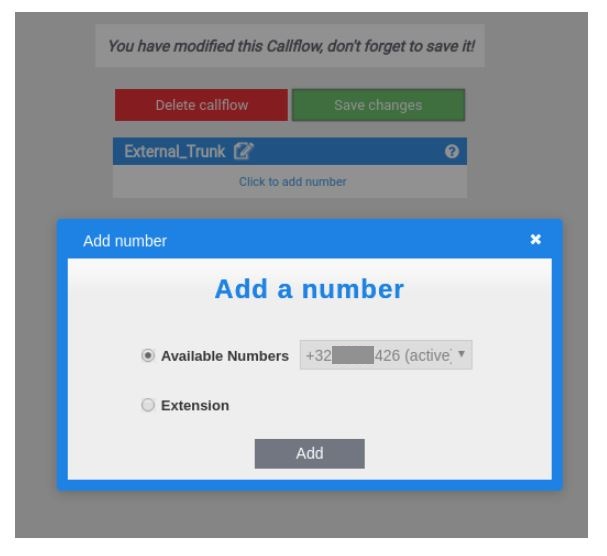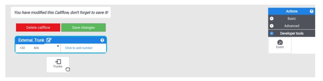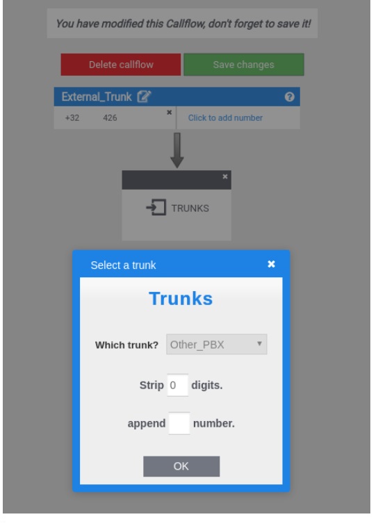 6- For incoming calls, create a callflow with the DID and a “trunk” bloc that points the right trunk