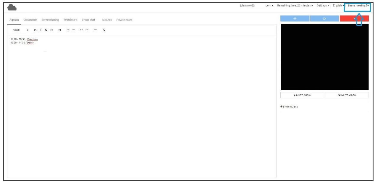 You can leave the meeting by clicking on the “Leave meeting” button on the right top corner of your interface.